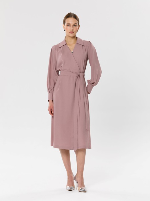 Модель х-силуэта, с отрезной линией талии, собраной на резину, без подклада. Перед ассиметричный, с запахом. По талии и плечевым швам заложенны защипы. V-образный вырез горловины декорирован пуговицей. Рукав со складками по окату и низу, на манжете с застёжкой на петлю и пуговицу. Талия подчёркнута съёмным завязывающимся поясом из основной ткани.