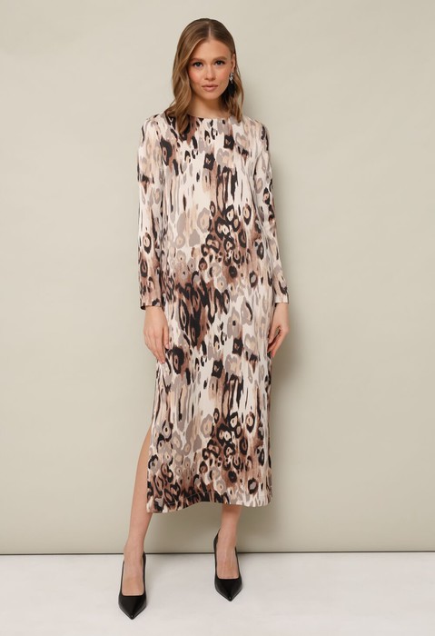 Платье прямого силуэта в длине миди, выполнено из струящейся ткани с благородным матовым блеском и актуальным абстрактным дизайном. Округлый вырез горловины. Рукава длинные втачные. Застежка по спинке в среднем шве «капля» на пуговицу и навесную петлю. По низу в боковых швах обработаны высокие разрезы.