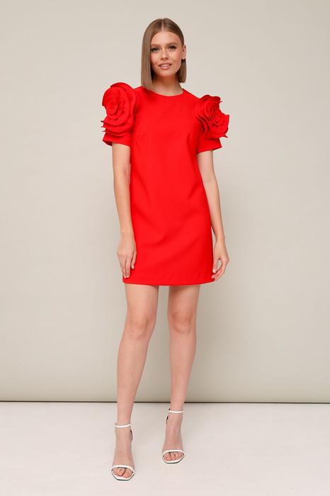 Платье А-образного силуэта. Округлый вырез горловины. Втачные короткие рукава, декорированные элементами из основной ткани в виде цветка. Застежка по спинке в среднем шве на потайную молнию. Платье без подкладки.