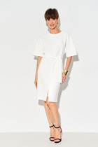 Платье отрезное по линии талии, полуприлегающего кроя, выполнено из плательной струящейся ткани. Горловина с рубашечным воротником на притачной стойке. Лиф с центральной застежкой на потайную планку на петли и пуговицы. По талии обработана резинка для регуляции размера. Юбка с имитацией запаха с застежкой на притачной пояс из основной ткани, который фиксируется на бант. Рукава длинные с притачной манжетой с застежкой на пуговицы.