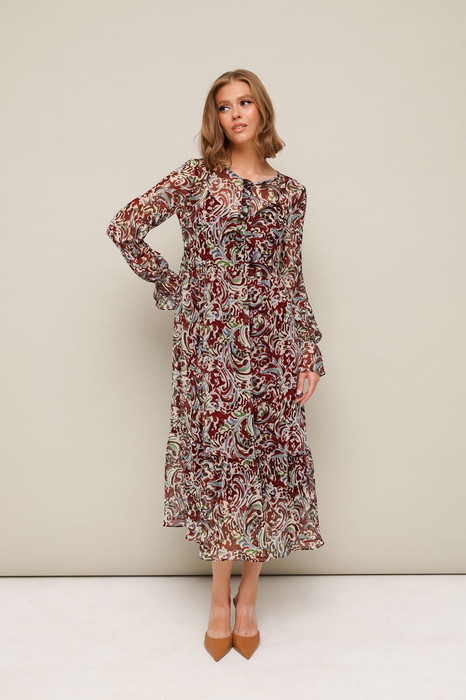 Платье из шифона с абстрактным принтом, отрезное выше линии талии. Горловина округлой формы. Лиф платья с застежкой на притачные планки с петлями и пуговицами. Нижняя часть платья с притачным воланом со сборкой. Рукава длинные втачные на резинке в области запястья. В комплекте прилагается нижнее платье-комбинация на регулируемых бретелях.