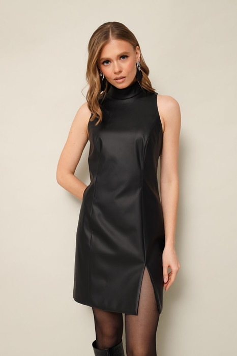 Стильное платье полуприлегающего силуэта, выполнено из качественной экокожи. Горловина округлой формы с отрезной стойкой. Перед и спинка с рельефами, по правой стороне обработан разрез в рельефном шве. В среднем шве спинки застежка на потайную молнию. Платье на подкладке.