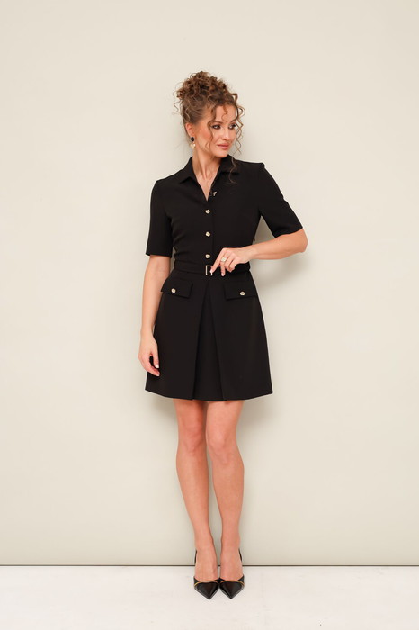 Платье отрезное по линии талии, выполнено из плательной ткани. Горловина с отложным воротником. Лиф с центральной застёжкой на петли и пуговицы. Втачные короткие рукава. Юбка А-образного силуэта, с центральной встречной складкой и с накладными клапанами с пуговицами. В комплекте съемный пояс с пряжкой. По талиии предусмотрены шлевки.