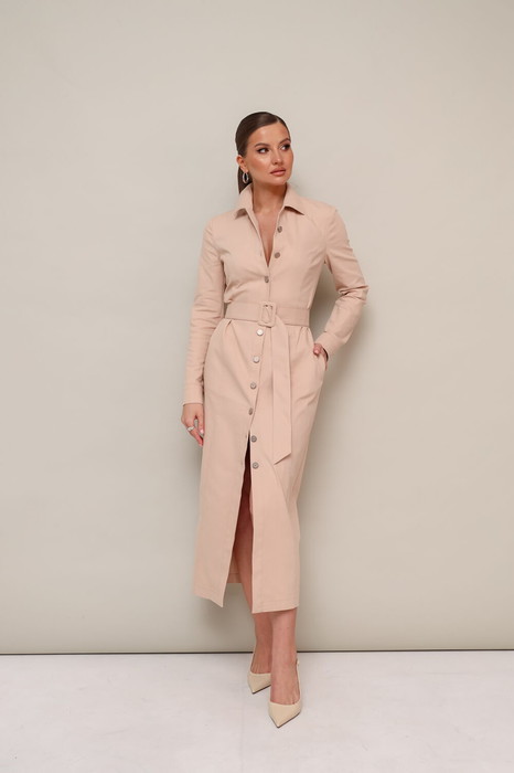 Отложной воротник с цельнокроеной стойкой. Центральная застёжка на джинсовые пуговицы, перед с рельефами, в боковых швах обработаны функциональные карманы. Втачные двухшовные рукава с манжетами с застежкой на пуговицы. Спинка со средним швом. В комплекте прилагается пояс из основной ткани с пряжкой.