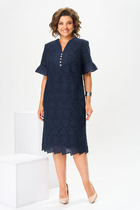 Платье свободного кроя, длиной до середины бедра. На левом переде настрочен накладной карман. Воротник пиджачного типа. Застежка по переду потайная на петли и пуговицы. Рукава одношовные, втачные, длинные. По низу рукава обработан разрез, односторонние складки и притачная манжета, которая застегивается на навесные петли и пуговицы. Платье дополняет съемный пояс с пряжкой.