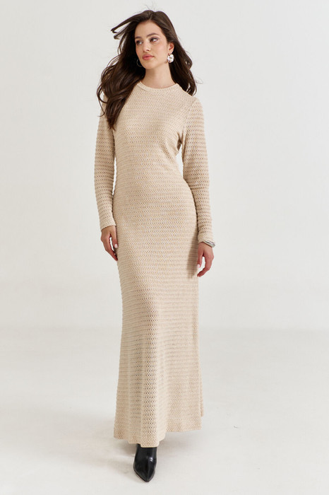 Платье полуприлегающего силуэта, расширенное к низу, длиной макси. По спинке средний шов и талиевые вытачки. Рукава одношовные, втачные, длинные. Горловина округлой формы, обработана притачной планкой.