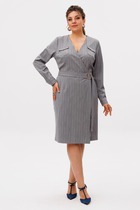 Платье женское, полу прилегающего силуэта, длиной за колено. Перед отрезной по линии талии. Верхняя часть переда с 2-мя талиевыми вытачками. Нижняя часть с 2-мя талиевыми вытачками и с запахом. Спинка со средним швом и 2-мя талиевыми вытачками. Горловина с цельнокроеной обтачкой стойкой, с фигурным вырезом с запахом. Застежка на потайную тесьму-молнию в левом боковом шве платья. Рукав втачной, одно шовный, длинный из отделочной ткани, по окату и низу рукава легкая сборка. Рукав с притачной манжетой с застежкой на 10 пришивных пуговиц. Платье с плечевыми накладками. Платье со съёмным поясом. Длина спинки 100 см. Длина рукава 61 см
