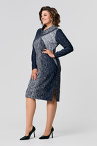 Платье женское относится к нарядной торжественной одежде. Платье полуприлегающего силуэта, с отлетной накидкой длиной за колено. Перед с двумя нагрудными вытачками, с двумя талиевыми вытачками. Спинка с двумя талиевыми вытачками и средним швом, заканчивающимся шлицей. Застежка на потайную тесьму-молнию в среднем шве спинки. Горловина круглая, обтачная, без воротника, по горловине закреплена накидка. Слева на уровне линии талии отделочным хлястиком, декорированным тесьмой накидка закрепляется на платье, нижняя часть накидки закреплена в левом боковом шве. Накидка с фигурным низом. Платье без рукавов. Длина спинки 103 см. Длина накидки от горловины 38 см
