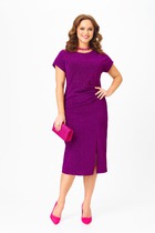 Платье женское, относится к нарядной торжественной одежде. Платье женское  полу прилегающего силуэта, длиной за колено, выполнено в виде имитации костюма. Лиф платья отлетной. Перед с 2-мя отрезными бочками, левый бочок с отделочным фигурным поясом, декорированным объёмным украшением, шов притачивания левого бочка с разрезом с закруглёнными концами. Спинка лифа со средним швом и 2-мя отрезными бочками. Лиф платья на подкладке, к которой крепится нижняя часть платья (юбка). Переднее полотнище нижней части с 2-мя таллиевыми вытачками. Заднее полотнище с 2-мя таллиевыми вытачками и средним швом, заканчивающимся шлицей. Нижняя часть платья на подкладке. Горловина круглая, обтачная, без воротника. Застёжка на потайную тесьму-молнию в среднем шве спинки. Рукав втачной, одно шовный, длиной 3/4. Низ рукава со встречной складкой, обточной, складка декорирована пришивной пуговицей. Платье с плечевыми накладками. Длина спинки 104 см, длина рукава 42 см.