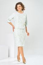 Платье женское, относится к нарядной торжественной одежде. Платье женское полу прилегающего силуэта, длиной за колено, выполнено в виде имитации костюма. Лиф платья отлетной. Перед с 2-мя отрезными бочками, левый бочок с отделочным фигурным поясом, декорированным объёмным украшением, шов притачивания левого бочка с разрезом с закруглёнными концами. Спинка лифа со средним швом и 2-мя отрезными бочками. Лиф платья на подкладке, к которой крепится нижняя часть платья (юбка). Переднее полотнище нижней части с 2-мя таллиевыми вытачками. Заднее полотнище с 2-мя таллиевыми вытачками и средним швом, заканчивающимся шлицей. Нижняя часть платья на подкладке. Горловина круглая, обтачная, без воротника. Застёжка на потайную тесьму-молнию в среднем шве спинки. Рукав втачной, одно шовный, длиной 3/4. Низ рукава со встречной складкой, обточной, складка декорирована пришивной пуговицей. Платье с плечевыми накладками. Длина спинки 104 см, длина рукава 42 см.