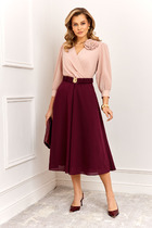 Платье предназначено для повседневной носки. Платье женское, полу прилегающего силуэта, длиной ниже колена. Верхняя часть платья (лиф)отлётная с фигурным низом "ступенька". Верхняя часть переда с 2-мя отрезными бочками. Верхняя часть спинки с 2-мя таллиевыми вытачками. Нижняя часть платья (юбки) из отделочной ткани. Нижняя часть переда с 2-мя таллиевыми вытачками. Нижняя часть спинки с 2-мя таллиевыми вытачками и средним швом, заканчивающимся шлицей. Горловина круглая с отрезной планкой, шов втачивания планки декорирован притачным кантом. Рукав втачной, одно шовный, длинный. Платье с плечевыми накладками. Длина спинки 110 см, длина рукава 57 см.