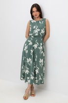Платье женское, предназначено для повседневной носки. Платье женское отрезное по линии талии, расширенное к низу, длинной ниже колена на 15 см. Верхняя часть переда с 2-мя нагрудными вытачкам, с 2-мя притачными вертикальными планками, нижняя часть переда, с 2-мя притачными бочками, швы притачивания бочков заканчиваются шлицами. Верхняя часть спинки и нижняя часть спинки цельнокроеные. По линии талии платье собрано на эластичную тесьму. Горловина круглая, с втачным воротником рубашечного типа с отрезной стойкой. Застёжка центральная на 6-ть пробивных металлических кнопок. Рукав втачной одно шовный, длиной 3/4 с фигурным низом, собранным на эластичную тесьму. Платье с плечевыми накладками. Длина спинки платья 115 см. Длина рукава 44 см.