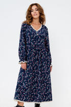 Платье женское, относится к торжественной одежде. Платье женское, отрезное по линии талии, расширенное к низу. Верхняя часть переда с 2-мя отрезными бочками, нижняя без конструктивных особенностей. Верхняя часть спинки со средним швом и 2-мя таллиевыми вытачками, нижняя без конструктивных особенностей. Горловина с V-образным вырезом, с запахом, обтачная без воротника. Застёжка на потайную тесьму-молнию в левом боковом шве платья. Рукав втачной, одно шовный, расширенный к низу, 2-мя односторонними складками по окату, рукав короткий. Платье с плечевыми накладками. К платью прилагается съёмный пояс с застёжкой на пряжку и пробивные блочки.