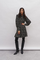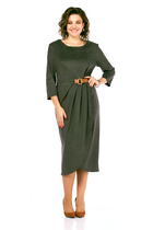 Платье женское относится к нарядной торжественной одежде. Платье женское полу прилегающего силуэта, длиной за колено. Перед с 2-мя отрезными бочками, швы соединения их с передом переходят в таллиевую вытачку. Спинка с 2-мя таллиевыми вытачками со средним швом, заканчивающимся шлицей. Горловина круглая обточная без воротника. Застёжка на потайную тесьму - молнию. Рукав втачной, одно шовный, расширенный к низу, с 5-ю встречными складками по низ, низ обтачной. Рукав на подкладке. Платье на подкладке. Платье с плечевыми накладками. К платью прилагается съёмное украшение. Длина спинки платья 100 см, длина рукава 50 см.