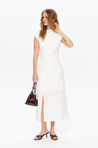 Платье женское, предназначено для повседневной носки. Платье женское отрезное по линии талии, слегка расширенное к низу, длиной до серединны икры. Верхняя часть переда с 2-мя нагрудными вытачками, с 2-мя вертикальными притачными планками, с 7-мью декоративными защипами шириной 0,3 см (с каждой стороны; нижняя часть переда с лёгкой сборкой по верхнему срезу по бокам). Верхняя часть спинки цельнокроеная; нижняя часть спинки с лёгкой сборкой по верхнему срезу. Платье с втачным поясом по линии талии с обработанной по ним кулисой с завязками с металлическими наконечниками. Горловина круглая с втачной стойкой. Застёжка центральная на верхней части переда на 5-ть вертикально обмётанных петель и 5-ть пришивных пуговиц. Рукав втачной, одно шовный длинный со сборкой и притачной манжетой, с застёжкой на обмётанную петлю и пришивную пуговицу. Платье на подкладке. Платье с плечевыми накладками. Длина спинки платья 126 см. Длина рукава 59 см.