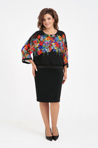 Платье женское относится к нарядной торжественной одежде, но может использовано и при повседневной носке. Платье женское, отрезное по линии талии, расширенное к низу, длиной за колено. Верхняя часть переда с отрезными рельефами, выходящими из плечевых швов, центральная часть с зафиксированным запахом. Верхняя часть спинки со средним швом и 2-мя рельефами, выходящими из плечевых швов. Горловина с V-образным вырезом, фигурная, обточная без воротника. Нижняя часть переда и нижняя часть спинки цельнокроеные, выполнены из отделочной ткани. Шов соединения верхней и нижней частей платья декорирован притачной фигурной отлетной баской. Платье с декоративным поясом из отделочной ткани, закреплённом на левом боковом шве и фиксирующимся в бант через металлическую пробивную блочку на центральной части переда. Рукав одно шовный втачной, длиной до локтя, с притачной фигурной манжетой. Платье с плечевыми накладками. Нижняя часть на подкладке. Длина платья 112 см, длина рукава 33 см.