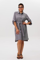 Платье женское относится к нарядной торжественной одежде, но может использовано и при повседневной носке. Платье женское, отрезное по линии талии, расширенное к низу, длиной за колено. Верхняя часть переда с отрезными рельефами, выходящими из плечевых швов, центральная часть с зафиксированным запахом. Верхняя часть спинки со средним швом и 2-мя рельефами, выходящими из плечевых швов. Горловина с V-образным вырезом, фигурная, обточная без воротника. Нижняя часть переда и нижняя часть спинки цельнокроеные, выполнены из отделочной ткани. Шов соединения верхней и нижней частей платья декорирован притачной фигурной отлетной баской. Платье с декоративным поясом из отделочной ткани, закреплённом на левом боковом шве и фиксирующимся в бант через металлическую пробивную блочку на центральной части переда. Рукав одно шовный втачной, длиной до локтя, с притачной фигурной манжетой. Платье с плечевыми накладками. Нижняя часть на подкладке. Длина платья 112 см, длина рукава 33 см.