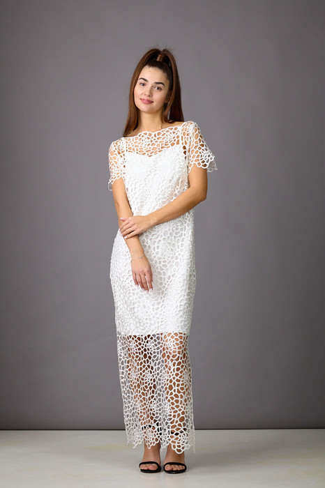 Платье из кружева прямого силуэта с вытачками по переду. Рукава короткие.