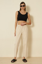 Платье женское из гладкокрашеного тканого полотна, свободное, слегка расширенное к низу, с глубоким V-образным вырезом горловины, обработанным внутренней обтачкой, без рукавов, с вытачками в области груди. Перед состоит из двух частей, в шве соединения деталей по центру длинный разрез.