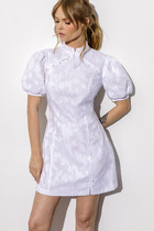 Платье женское из гладкокрашеного тканого полотна, свободное, слегка расширенное к низу, с глубоким V-образным вырезом горловины, обработанным внутренней обтачкой, без рукавов, с вытачками в области груди. Перед состоит из двух частей, в шве соединения деталей по центру длинный разрез.