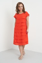 Платье женское силуэта "трапеция" длиной выше линии колена. Рукав втачной одношовный, который по низу собран на резинку. Полочка и спинка на трикотажной подкладке. По низу платья пришит двойной волан. По переду принт платья украшен термостразами.