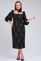 Платье из струящейся поливискозной ткани Х-образного силуэта, отрезное по линии талии. По переду и спинке лифа расположены талиевые вытачки. Юбка расклешённая, на трикотажной подкладке. В среднем шве спинки предусмотрена молния. Рукав втачной, одношовный длиной 4/5. Низ рукава собран эластичной тесьмой. длина рукава 51см (±1см).