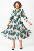 Платье из текстиля  прилегающего силуэта. Платье отрезное по линии талии. По переду и спинке лифа расположены рельефы. Юбка расклешенная из шести клиньев со встречными складками по линии талии. В среднем шве спинки предусмотрена молния. Рукав втачной покроя тюльпан, длина рукава 15 см. В комплекте ремень с декоративной пряжкой.