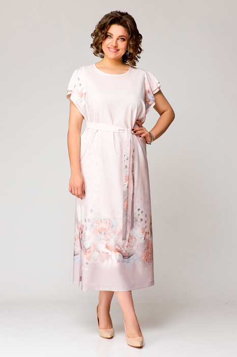 Платье женское из лёгкой ткани, прямого силуэта со съёмным поясом. По переду платья нагрудные выточки, спинка цельная. Вырез горловины овальный, сзади застёжка в виде капельки, на навесную петлю и пуговицу. В пройму вставлены двойные воланы, длина нижнего волана – 15см, верхнего – 12 см. В боковых швах платья разрезы длиной 32 см. Длина платья по спинке 127 см. (+-1 см)