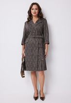 Лиф полочки с нагрудными выточками и округлым вырезом горловины, лиф спинки с центральным швом и V-образным вырезом горловины. Юбка состоит из передней и задней деталей с цельнокроенными планками по бокам, которые скреплены декоративными пуговицами. На передней детали юбки настрочены накладные карманы. Рукав втачной, короткий длиной – 28 см.