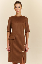 Платье женское из мягкой вискозной ткани, Х-образного силуэта с полуприлегающим лифом. Платье отрезное по линии талии. По переду лифа отрезные рельефы, по спинке талиевые выточки. Юбка расклешённая из шести клиньев со встречными складками по линии талии. В среднем шве спинки застёжка на потайную тесьму-молнию. Рукав втачной покроя тюльпан, длина рукава 15 см.