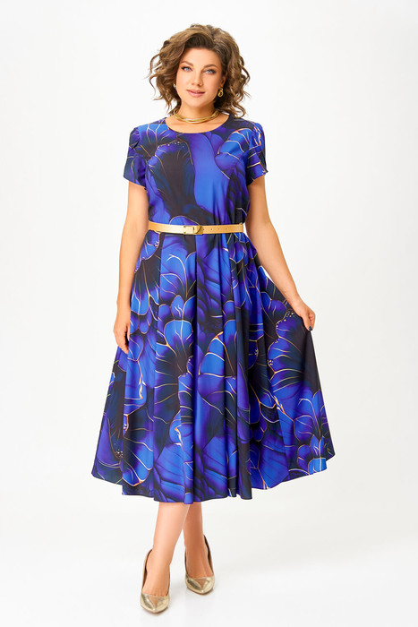 Платье женское из мягкой вискозной ткани, Х-образного  силуэта с полуприлегающим лифом. Платье отрезное по линии талии. По переду лифа отрезные рельефы, по спинке талиевые вытачки. Юбка расклешённая из шести клиньев со встречными складками по линии талии. В среднем шве спинки застёжка на потайную тесьму-молнию. Рукав втачной покроя тюльпан, длина рукава 15 см.