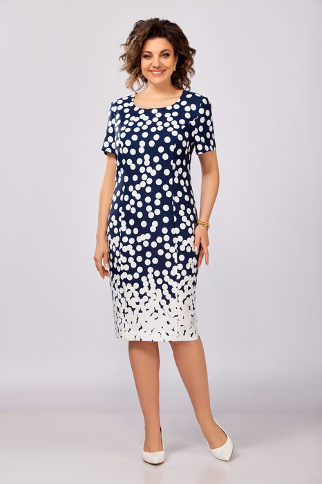 Платье полуприлегающего силуэта из мягкой поливискозной ткани с оригинальным дизайнерским принтом. По полочке выполнены рельефные швы, по спинке рельефные швы, средний шов со шлицей и застёжкой на потайную тесьму-молнию. Горловина круглая, обработана обтачкой. Рукав втачной, короткий.