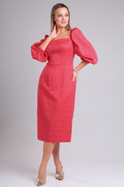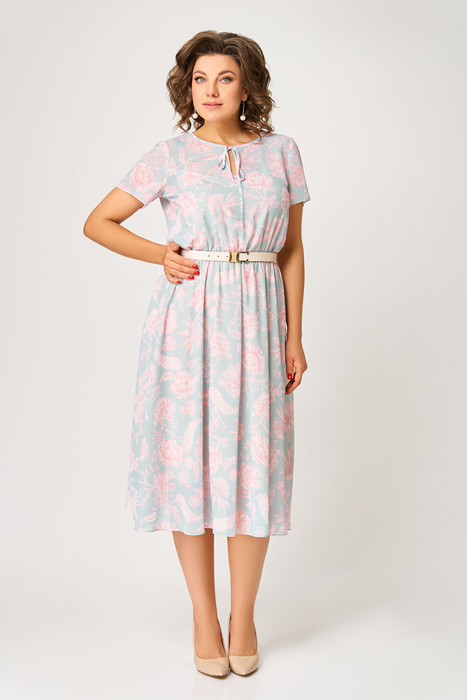 Платье из мягкой шифоновой ткани, на трикотажной подкладке, отрезное по линии талии, шов собран на эластичную тесьму-резинку. Горловина округлой формы, по переду капелька с завязкой. Рукав втачной, короткий.