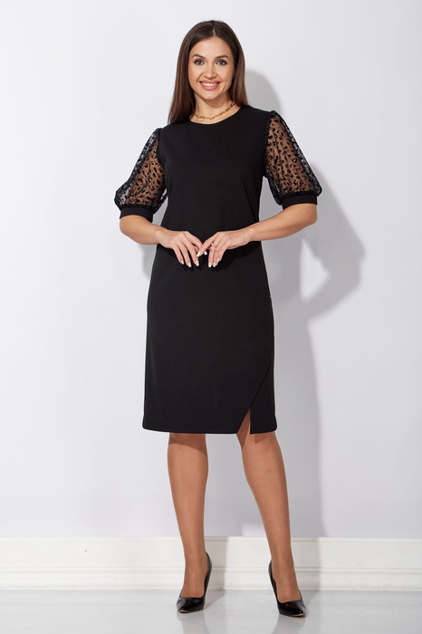 Платье женское, полуприлегающего силуэта с коротким рукавом. Рукав типа "фонарик" со сборкой сверху и снизу. По низу притачная манжета. По переду нагрудные вытачки. Горловина круглой формы. По низу ассиметричная, отлетная планка с разрезом и декоративная нашивка. По спинке средний шов с разрезом снизу и талевые вытачки. Горизонтальный подрез выше линии талии. Верхняя часть спинки и рукав выполнены из ткани сетка с флоковым нанесением. Застежка на потайную "молнию"