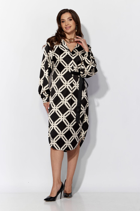 Платье женское, прямого силуэта с длинным рукавом. Рукав со спущенной линией плеча, по низу присобран на манжету. Манжета с застежкой на кнопки, с возможностью регулировки по ширине. Горловина оформлена воротником, с отделочной кнопкой и мягкой складкой по центру переда. По спинке кокетка и складки из под нее. Низ платья фигурной формы с разрезами по бокам. Талия подчеркнута поясом из отделочной тесьмы. Пояс зафиксирован в боковом шве и складке переда/