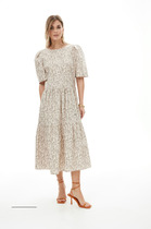 Платье женское, прямого силуэта, с рукавом длинной 7/8. Рукав со спущенной линией плеча. По переду и спинке отрезные кокетки. Спереди рельефные швы от кокетки и функциональные карманы в рельефах. По спинке средний шов от кокетки. Низ платья по спинке удлинен, с разрезами по бокам. Горловина круглой формы, оформлена расширенной стойкой. На рукаве отделочная нашивка.