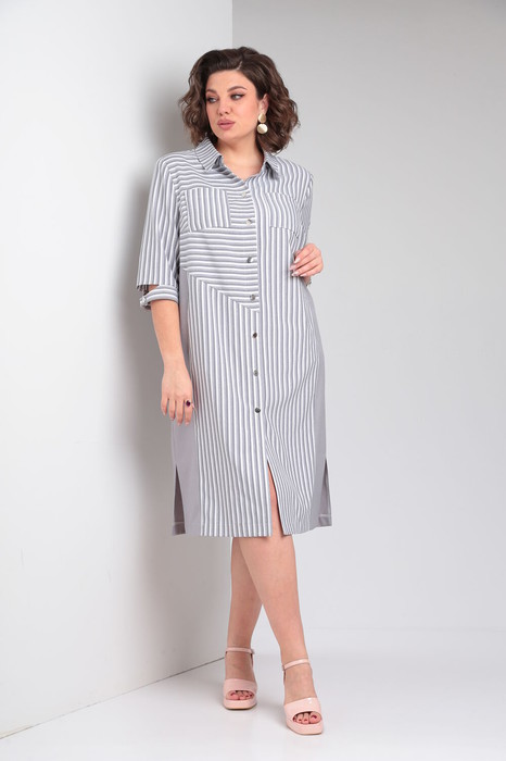 Стильное платье-рубашка прямого силуэта, выполненное из однотона и ткани в полоску. Свободный крой придает лёгкость и естественность модели.