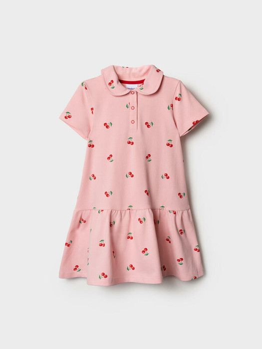 Летнее детское платье-поло для девочки. Выполнено из мягкого хлопкового трикотажа пике с милым принтом вишен. Короткие рукава с отворотами, классический воротник поло и застежка на кнопки спереди. По низу — присборенная юбка, создающая нежный силуэт.