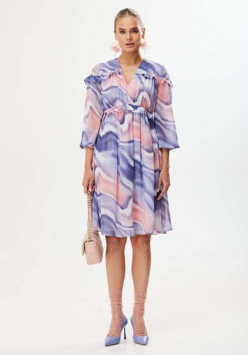 Женственное весеннее платье в нежных оттенках сирени и розы не оставит равнодушной ни одну представительницу прекрасного пола. Модель украшена лаконичными рюшами спереди и сзади. Рукав в 3/4 идеально подходит для весенней погоды. Платье можно надеть на прогулку, встречу с друзьями или вечеринку.