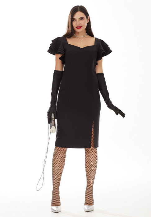 Платье женское приталенного силуэта, длиной до середины колена. Выполнено из ткани плательной группы. По переду платья расположены рельефы, идущие из линии проймы. В левом рельефе по низу расположен высокий разрез. На спинке талиевые выточки и средний шов, в котором обработана застежка на "тесьму-молнию". Рукава короткие, состоящие из трехъярусных воланов. Вырез горловины оформлен фигурным "каре".