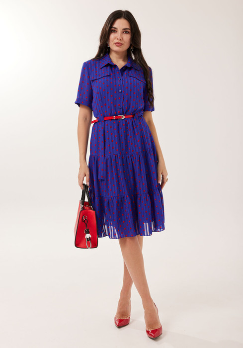 Платье полуприлегающего силуэта, от линии бедер расширенное к низу, выполненное из шифона, на трикотажной подкладке. В верхней части переда платья- нагрудные выточки, по центру- планка до линии талии, которая застёгивается на петли и пуговицы. В области груди расположены настрочные клапаны. Горловина платья обработана воротником со стойкой, рубашечного типа. Нижняя часть платья состоит из валанов. В области талии настраиваются шлевки, с декоративной тесьмой, спускающиеся до середины юбки платья. Рукава короткие с цельнокроенной манжетой и декоративной тесьмой. В комплект входит контрастный пояс из экокожи.