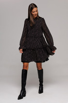 Элегантное платье полуприлегающего силуэта с асимметричной застежкой на петли и пуговицы. Перед платья с нагрудными вытачками и клапанами в области бёдер. На одном клапане, в качестве декора, — нашивка. Спинка с талиевыми вытачками и средним швом, внизу которого обработана шлица. Застежка асимметричная, двубортная, по низу платья расходится на разрез. В области плеч — погоны, закрепляющиеся на пуговицу. Рукава двухшовные втачные, длиной 3/4, с притачной манжетой. Платье с плечевыми накладками и со съёмным ремнем в цвет фурнитуры. Фурнитура (пуговицы и ремень) могут незначительно отличаться от представленных на фото.