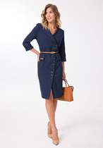Элегантное платье полуприлегающего силуэта с асимметричной застежкой на петли и пуговицы. Перед платья с нагрудными вытачками и клапанами в области бёдер. На одном клапане, в качестве декора, — нашивка. Спинка с талиевыми вытачками и средним швом, внизу которого обработана шлица. Застежка асимметричная, двубортная, по низу платья расходится на разрез. В области плеч — погоны, закрепляющиеся на пуговицу. Рукава двухшовные втачные, длиной 3/4, с притачной манжетой. Платье с плечевыми накладками и со съёмным ремнем в цвет фурнитуры. Фурнитура (пуговицы и ремень) могут незначительно отличаться от представленных на фото.