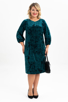 Платье женское полуприлегающего силуэта, выполненное из поливискозы плательной группы. Платье с двухбортной застежкой на петли-пуговицы. Горловина оформлена воротником пиджачного типа. Рукава двушовные, длиной 3/4, по низу обработаны притачной манжетой. По спинке - средний шов и талиевые выточки. По переду расположены нагрудные выточки. В левой боковой части переда вставлена отделочная деталь со складками, направленными к центру, над которой горизонтально расположена пата. В комплект к платью входит пояс из основной ткани с декоративной пряжкой, в цвет фурнитуры.