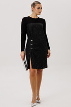 Эффектное платье прямого силуэта, выполненнное из поливискозы двух цветов. Перед платья с круглой горловиной и нагрудными вытачками. Перед платья в области бедра с косым подрезом. Нижняя часть переда состоит из верхней и нижней юбки. Верхняя юбка с косым низом и разрезом. Нижняя юбка из ткани контрастного цвета, имитирующая вторую юбку. Спинка с потайной молнией в среднем шве. Рукав втачной, длиной до линии локтя. В комплект к платью входит декоративная подвеска.