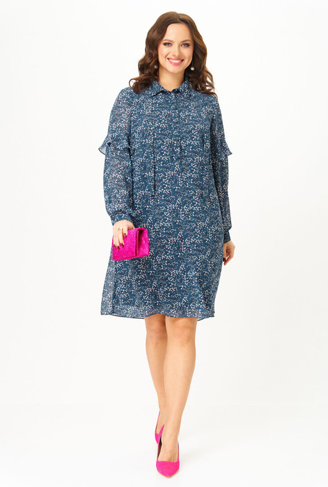 Платье прямого силуэта, длиной "миди", выполненое из  итальянского шифона. Перед и спинка платья цельнокроеные. Перед с нагрудными выточками и  центральной застёжкой до линии талии, на петли и пуговицы, на притачной планке.  Горловина обработана воротником рубашечного типа. Под воротником закреплена завязка, которая может использоваться в качестве декоративного небольшого банта. Спинка лифа цельнокроеная. Рукав втачной, длинный, с приточной манжетой по низу рукава, которая застёгивается на петлю и пуговицу. Чуть выше линии локтя, по рукаву, обработан декоративный  волан. В  боковых швах платья  обработаны карманы.