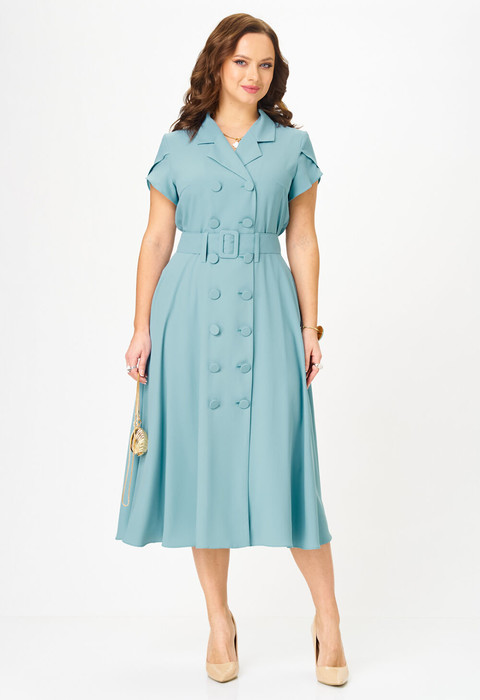 Платье А-силуэта длиной "мидакси", выполненое из струящейся плательной ткани, отрезное по линии талии. Перед с нагрудными вытачками и двухбортной застёжкой на петли и пуговицы. Горловина обработана воротником жакетного типа. Спинка лифа с кокеткой и встречной центральной складкой. Нижняя часть платья спинки цельнокроеная. По переду и спинке в области талии обработаны шлевки для пояса с пряжкой, который входит в комплект платья. Рукав втачной, короткий, формы "тюльпан", который удлиняется до линии локтя в зависимости от размера. В  боковых швах платья  обработаны карманы.