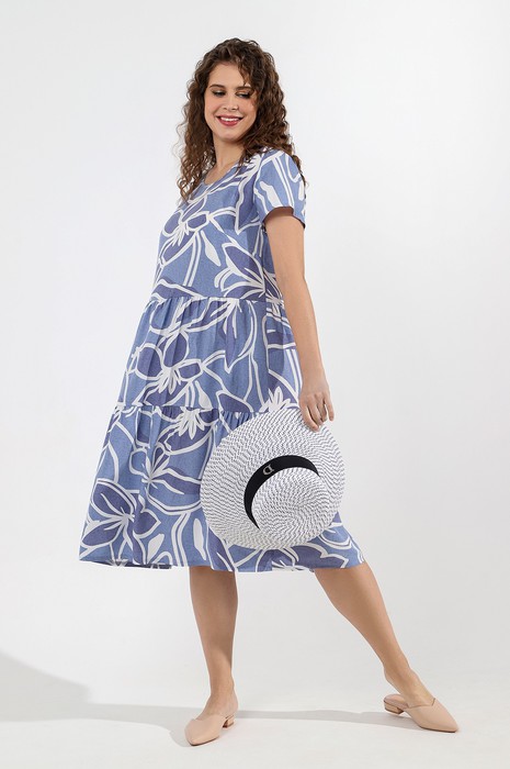 Платье из плательной штапельной ткани с набивным рисунком, свободного покроя, отрезное по линии талии, с короткими втачными рукавами и горловиной овальной формы, обработанной обтачкой. Полочка – с вытачками в области груди. Юбка – из двух ярусов, каждый из которых присборен по шву соединения с верхней деталью.