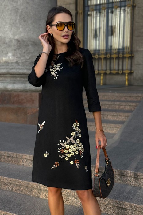 Чёрное платье с вышивкой — воплощение элегантности и роскоши. Нежное сочетание мягкой замшевой ткани и изящной вышивки придаёт платью неповторимый шарм. Это платье идеально подойдёт для особых случаев, когда нужно выглядеть стильно и женственно. Платье женское полуприлегающего силуэта из костюмно-плательной ткани - искусственная замша, длиной за колено, с многоцветной художественной вышивкой по переду. Платье на трикотажной подкладке по переду и спинке, отлетной по низу. Перед платья с нагрудными вытачками, выходящими из бокового шва. Спинка с талиевыми вытачками и средним швом, в верхней части которого обработана застежка на потайную тесьму-молнию. В боковых швах обработаны карманы в шве. Рукава втачные одношовные, длиной 3/4. Горловина круглой формы, обтачная. Средняя длина платья по среднему шву спинки - 98,0 см (±3,0 см), Средняя длина рукава - 42,0 см (±2,0 см)