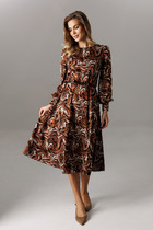Платье женское с декоративной симметричной вышивкой по полочкам, длиной за колено, трапециевидного свободного силуэта, отрезное по линии талии, со спущенными цельнокроеными рукавами.